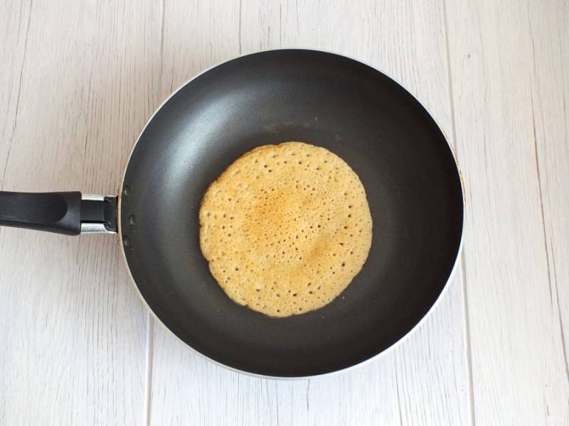 Разогрейте сковороду, смажьте маслом единожды. Налейте немного теста, и испеките небольшой блинчик обжаривая с двух сторон.