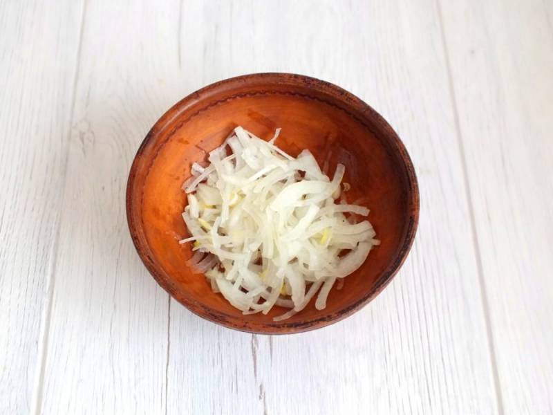Приготовьте начинку. Нарежете тонко луковицу, сбрызните яблочным уксусом. Оставьте на 5-10 минут.