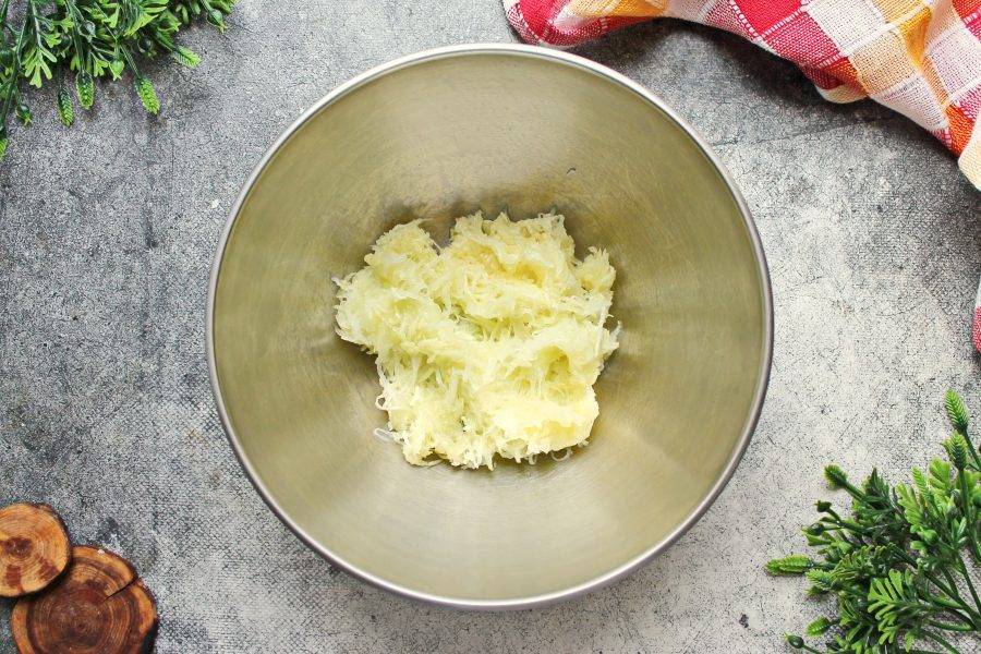 У кабачка отрежьте кончики и натрите на мелкой терке, выложите в миску. Так же измельчить овощ можно при помощи блендера, главное, чтобы не было крупных кусочков.