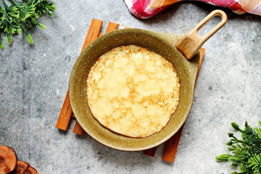 Сковороду нагрейте на медленном огне и смажьте растительным маслом. Тесто перемешайте и налейте часть на горячую сковороду. Испеките блинчик до золотистой корочки с двух сторон, примерно по 2-3 минуты с каждой стороны. Время будет зависеть от интенсивности огня и толщины блинчика.