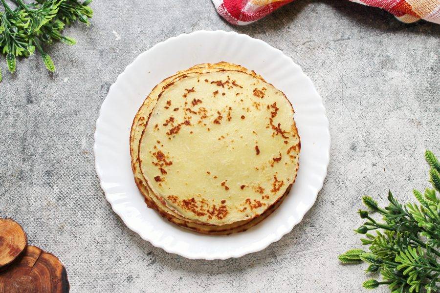 Испеките все блинчики, пока не закончится тесто, каждый раз смазывая сковороду маслом и укладывая их стопочкой.