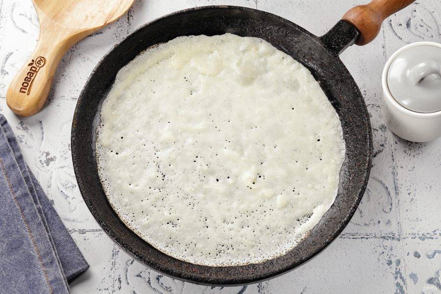 Блинную сковороду разогрейте до горячего состояния. Перед первым блином смажьте растительным маслом. Налейте немного теста (от этого тоже будет зависеть толщина блина) и распределите его по всей поверхности сковороды. В зависимости от нагрева вашей конфорки, может потребоваться разное время на жарку одного блина. Переворачивать блин следует, когда тесто сверху схватится и перестанет быть липким, а края начнут чуть-чуть темнеть.