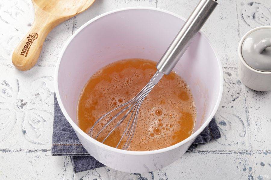 В глубокой миске соедините яйца, сахар и соль. Взбейте. Сильно взбивать не надо, достаточно, чтобы масса стала однородной.