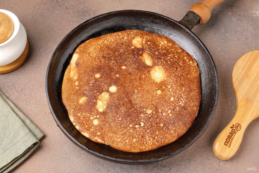 Сковороду разогрейте и смажьте маслом. Влейте тесто привычным способом и дождитесь на поверхности дырочек.