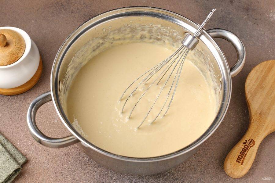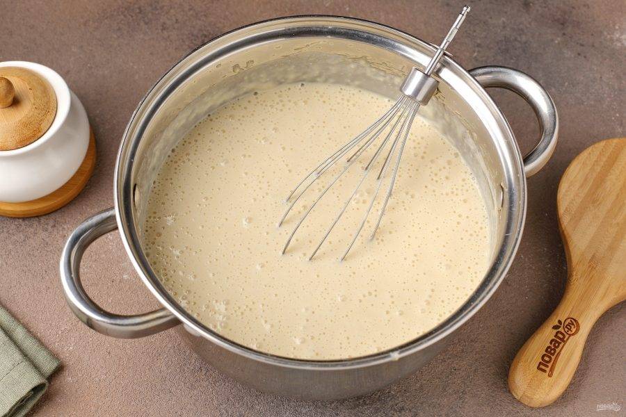 Оставшееся молоко доведите до кипения (я подогревала в микроволновке), добавьте соду и тонкой струйкой влейте в тесто, при этом непрерывно его перемешивая.