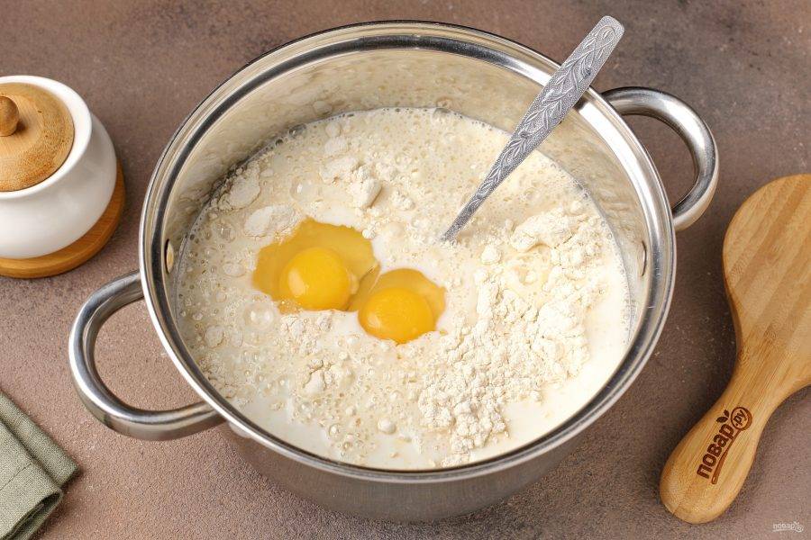 Добавьте 350 мл. тёплого молока и яйца.