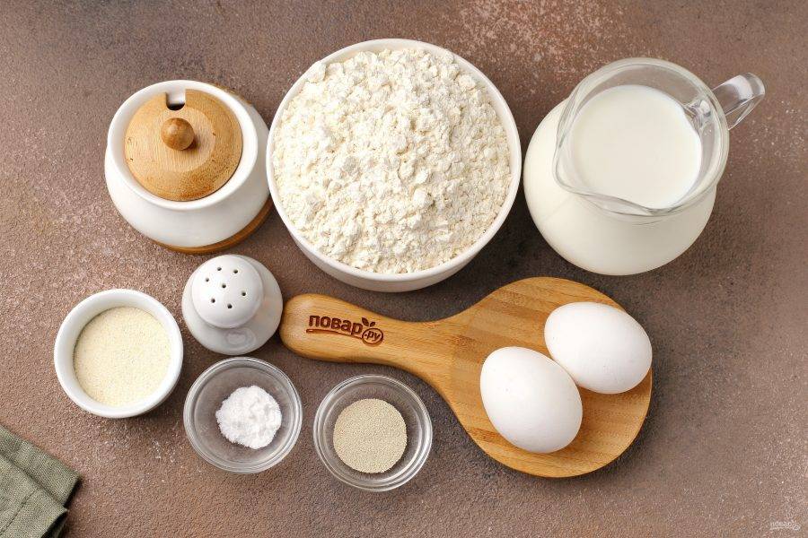 Соедините муку, сахар, соль, дрожжи и манку.