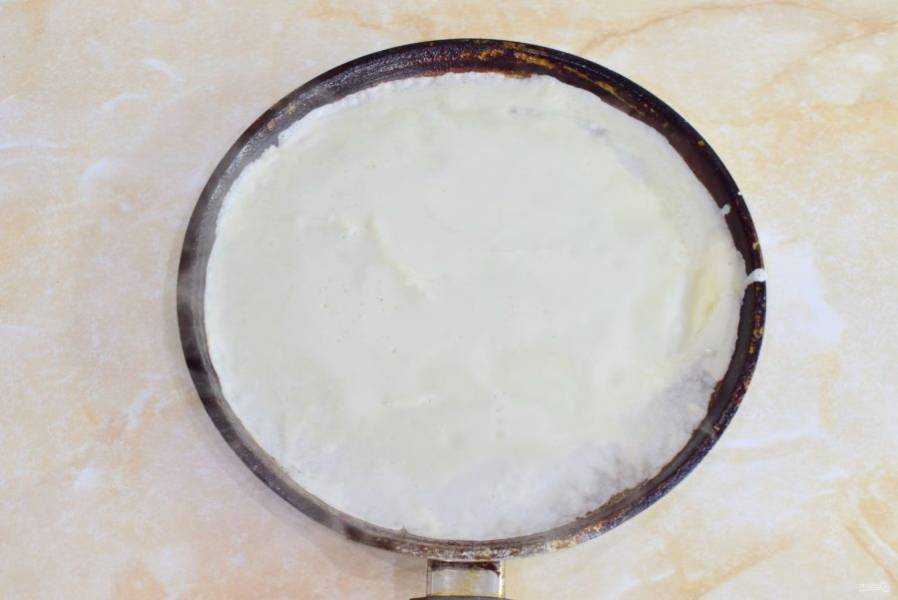 Перед первым блином смажьте горячую сковороду растительным маслом. Налейте тесто и распределите его тонким слоем по всей поверхности сковороды.