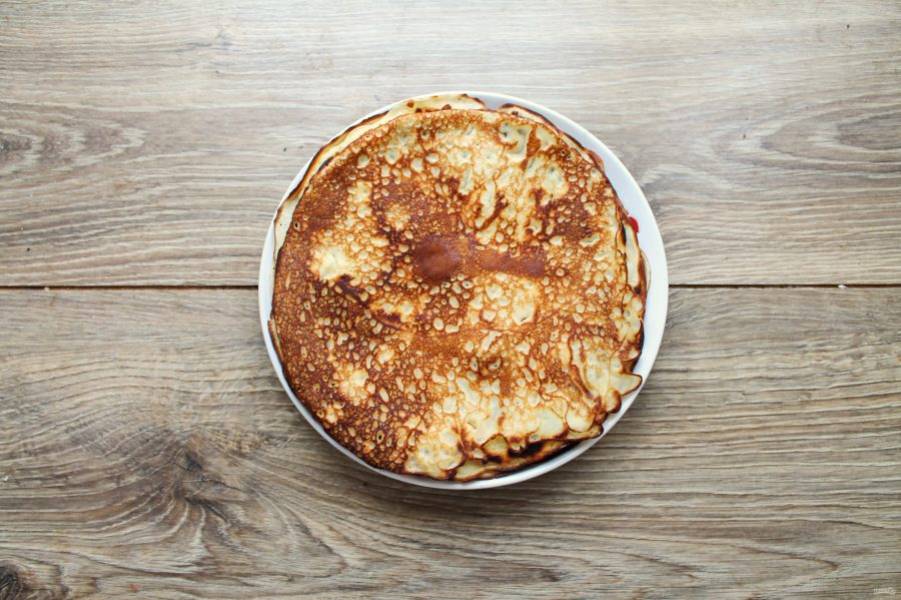 В горячей сковороде испеките тонкие блинчики. Сложите их стопочкой и накройте крышкой.