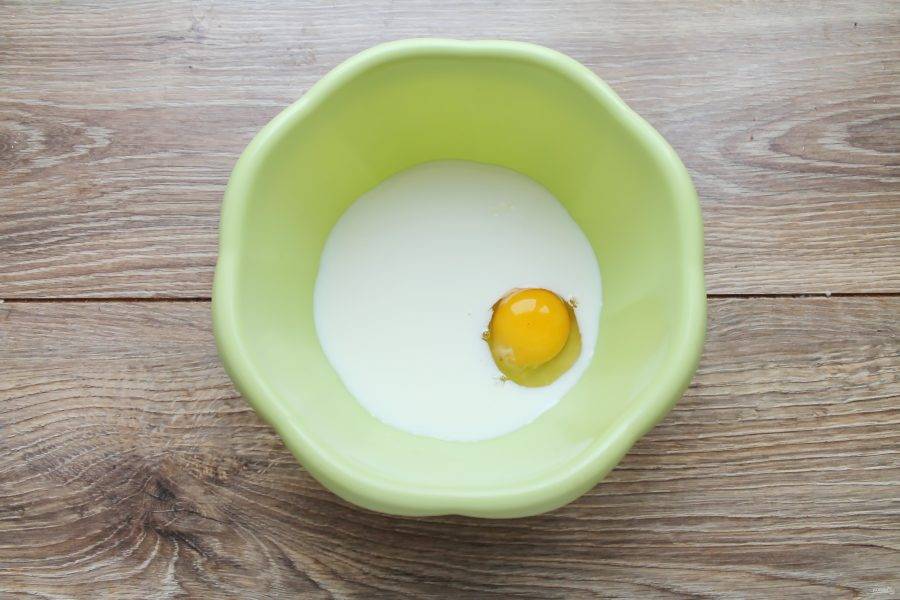 В миску налейте молоко, разбейте яйца, соль и сахар. Все хорошо перемешайте до однородности.