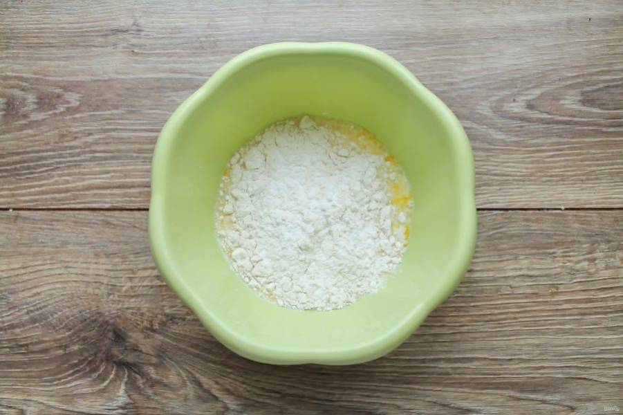 Смешайте муку с разрыхлителем и просейте в миску с молочной смесью. Все хорошо перемешайте венчиком до однородного теста без комочков.