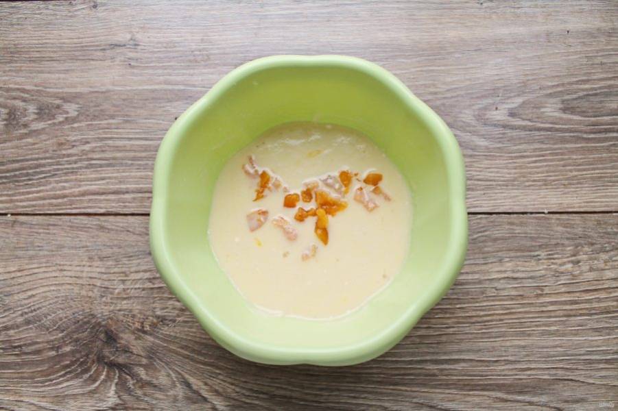 Влейте в тесто растительное масло и добавьте порезанные мелким кубиком абрикосы, перемешайте.