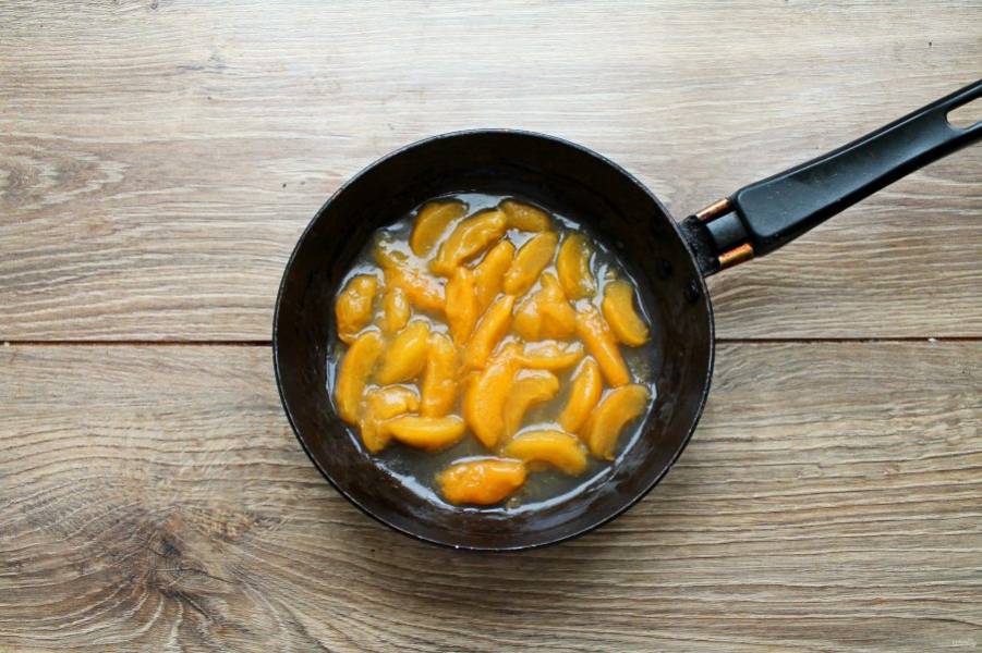 В сковороду с толстым дном выложите сахар, порезанные дольками абрикосы и влейте разведенный в воде крахмал.