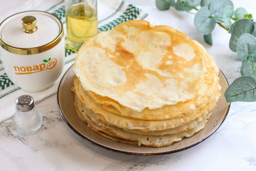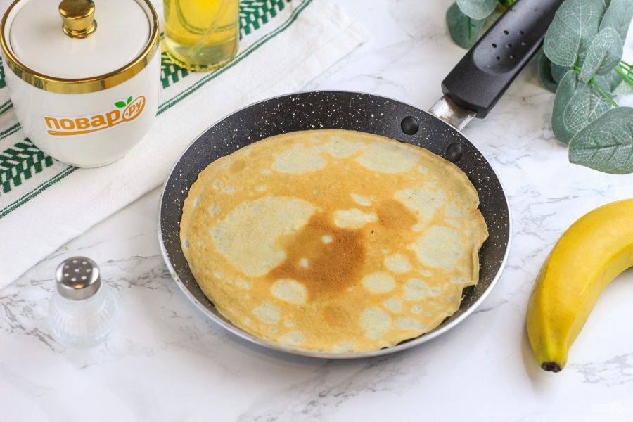 Разогрейте сковороду и смажьте ее маслом в первый раз. Перемешайте тесто, поднимая его со дна. Влейте порцию теста на сковороду и округлите. Испеките блин примерно 1-2 минуты с каждой стороны до румяности.