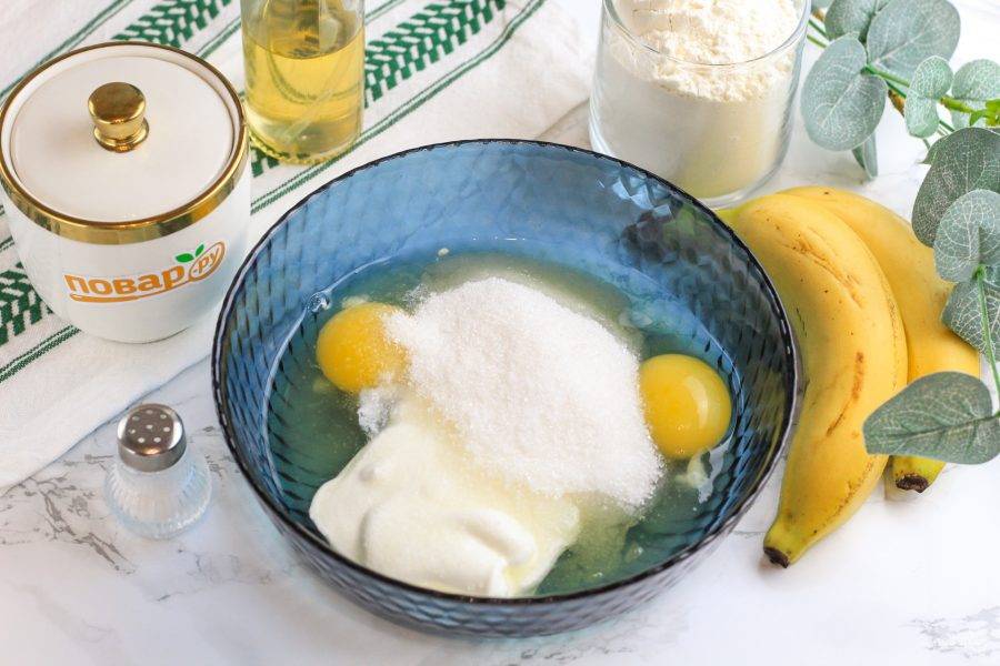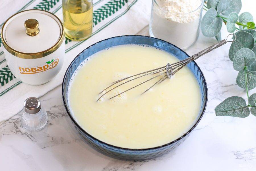 Выложите сметану любой жирности в глубокую емкость, вбейте туда же куриные яйца и всыпьте сахар, соль. По желанию можете заменить сахар сиропом стевии или не добавлять его вообще — тогда у вас получатся сладкие блины без сахара.