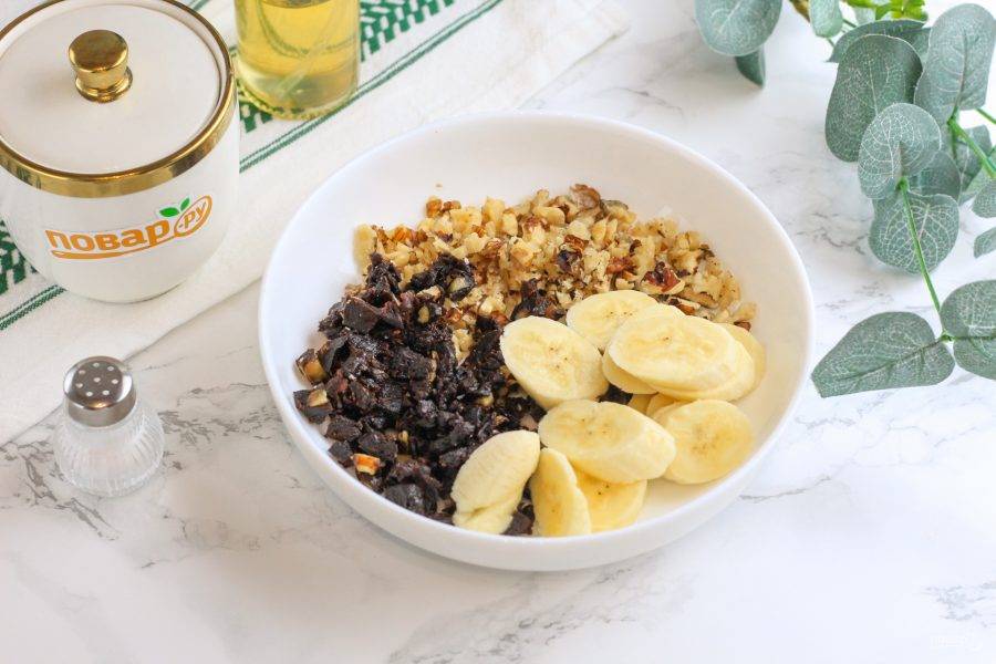 Банан очистите от кожуры и нарежьте кружочками или кубиками. Нарежьте чернослив и порубите ядра грецких орехов. Смешайте все в глубокой емкости.