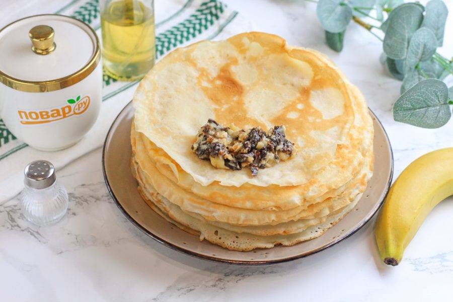 Побалуйте свою семью аппетитными румяными блинами с бананом, черносливом и орехами. Причем орехи вы можете использовать любые по своему вкусу: грецкие, фундук, арахис, кешью и т.д.