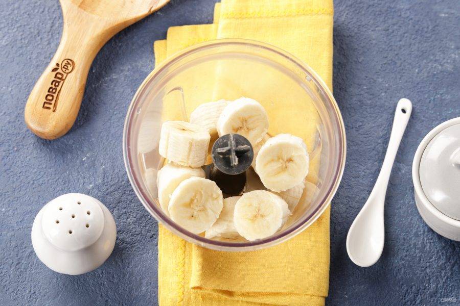 Для упрощения процесса приготовим тесто в блендере, но если у вас нет блендера, то готовьте тесто как обычное блинное, а банан разомните вилкой. Банан очистите и нарежьте кружочками.
