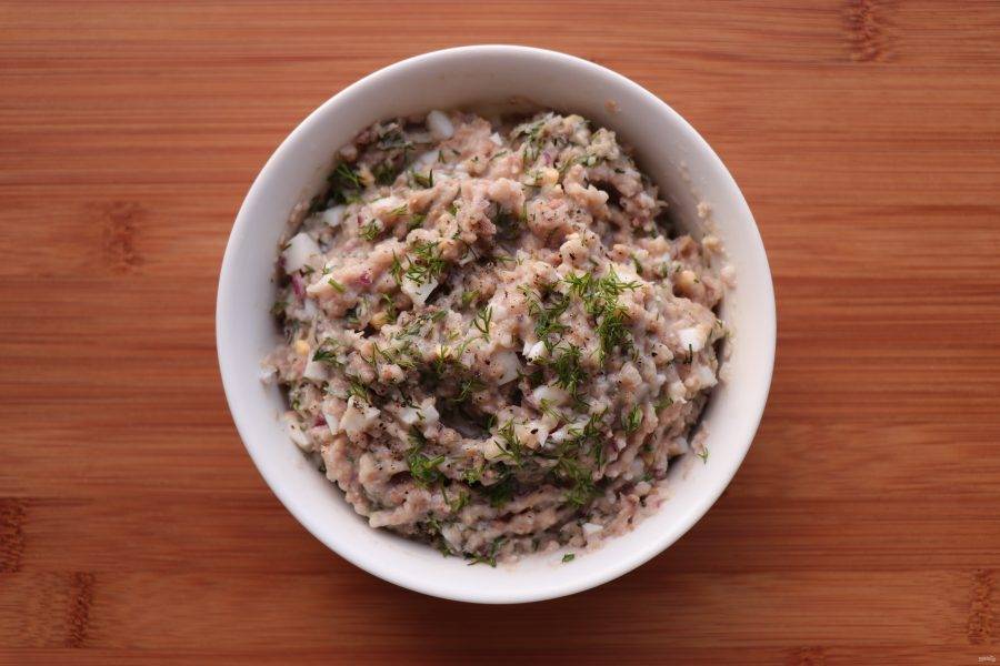 Добавьте мелко нарезанные вареные яйца, укроп и растопленное сливочное масло. Поперчите по вкусу. Перемешайте.