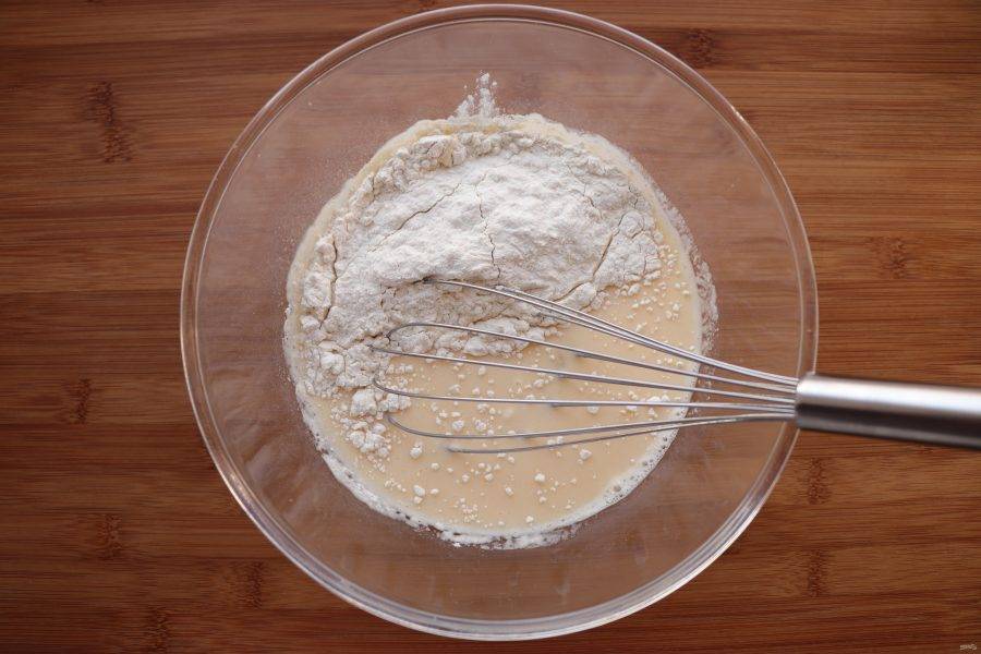Добавьте сахар, соль и постепенно муку. Перемешивайте тесто, чтобы не было комочков.