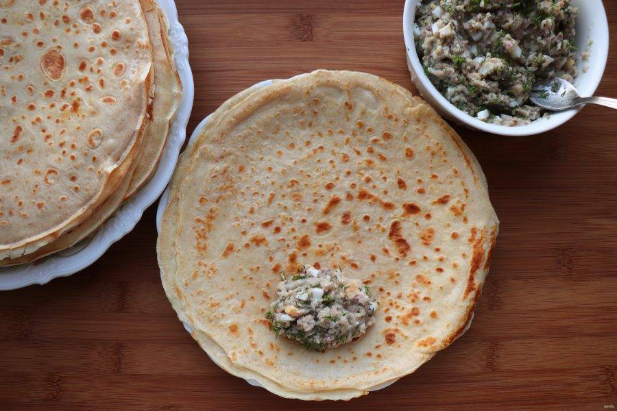 До подачи блинчики с форшмаком держите в холодильнике. Очень вкусно подавать такие блины со сметаной. Приятного аппетита!