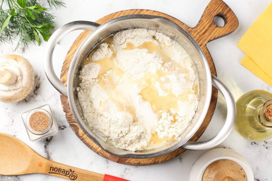Соедините яйца, соль, сахар, молоко, муку, соду и растительное масло.