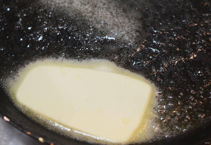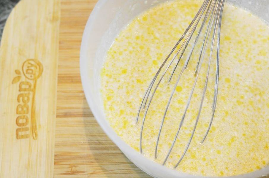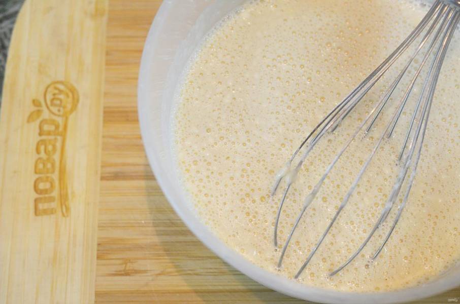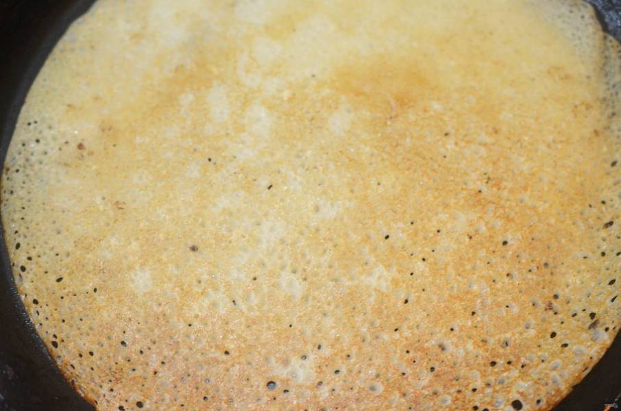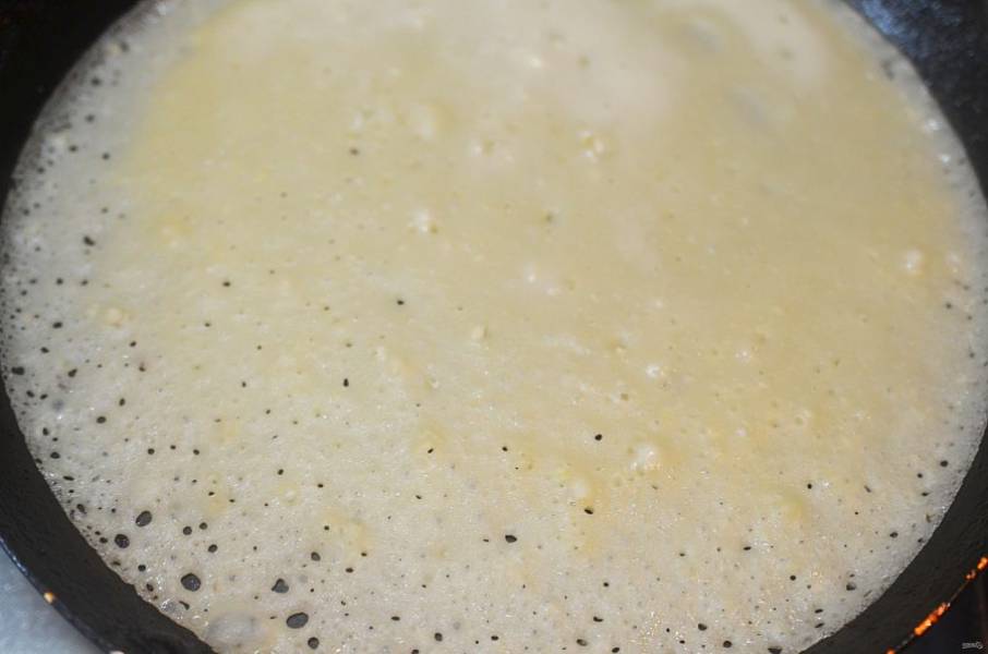 4. Вылейте половник теста на горячую сковороду, смазанную маслом. Выпекайте блин с одной стороны.