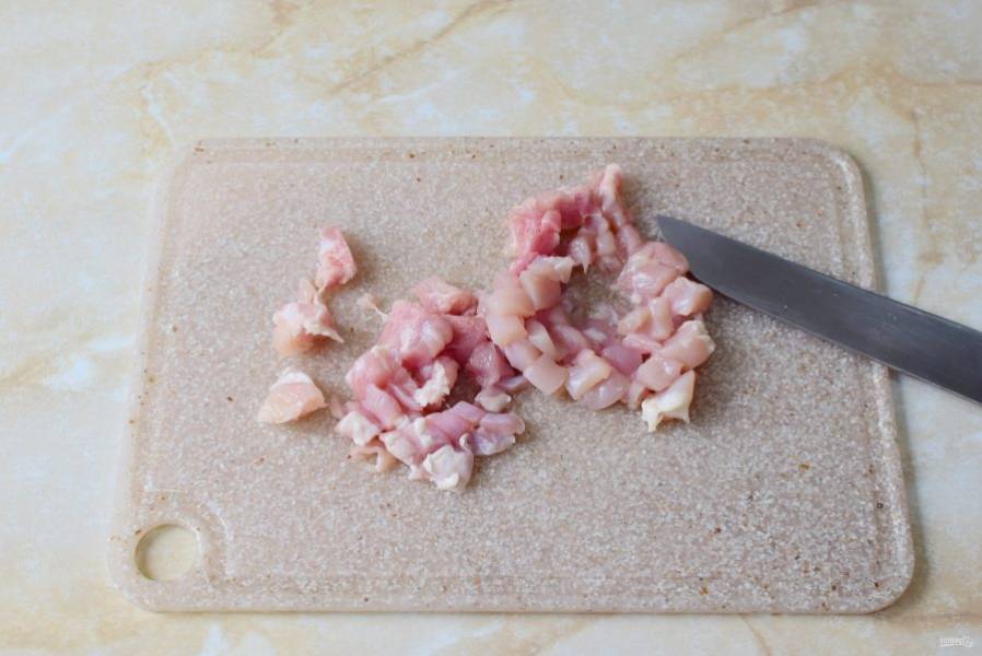 Затем выложите к луку нарезанное куриное мясо. Перемешайте. Обжаривайте на небольшом огне 12-15 минут. Можно накрыть крышкой.