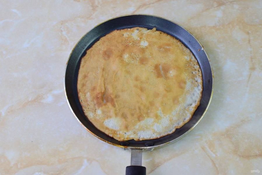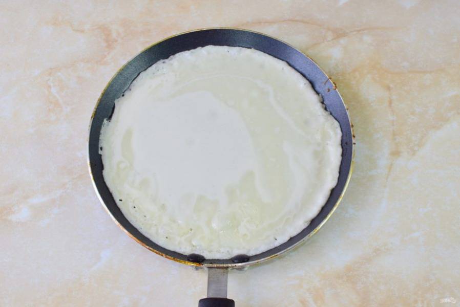 Разогрейте блинную сковороду до горячего состояния. Немного смажьте растительным маслом. Налейте тесто и тонким слоем распределите его по всей поверхности сковороды.