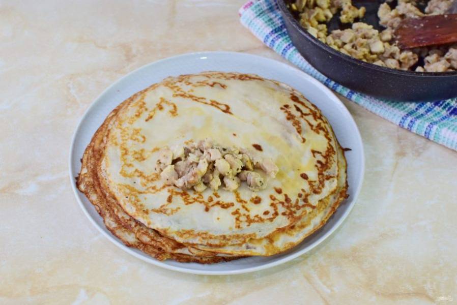 Готовую начинку выкладывайте на блинчик и сворачивайте его.