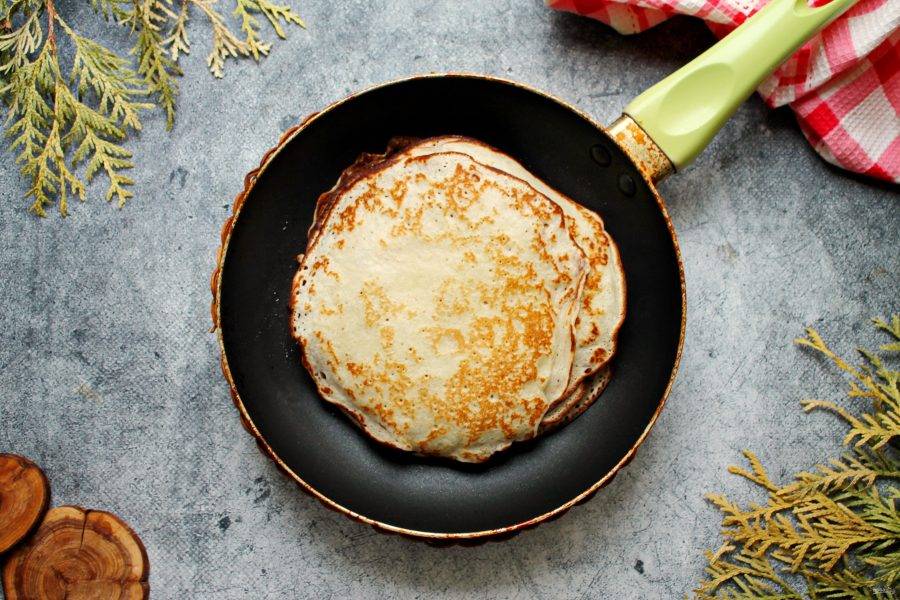 Сковороду разогрейте и смажьте растительным маслом. Налейте часть теста и распределите тонким слоем по всей поверхности. Испеките блин с двух сторон до румяной корочки и переложите на тарелку. Пеките блины пока не кончится тесто, у меня получилось 9 штук.