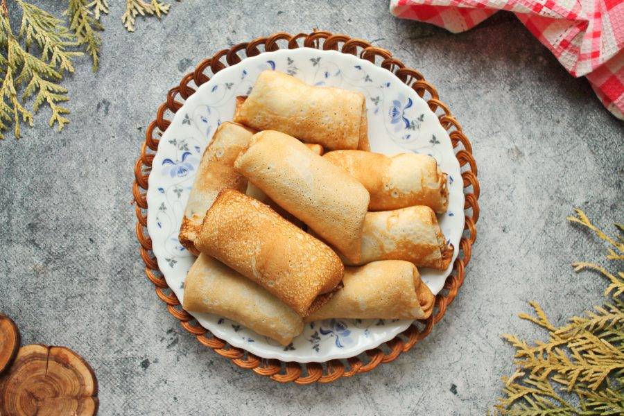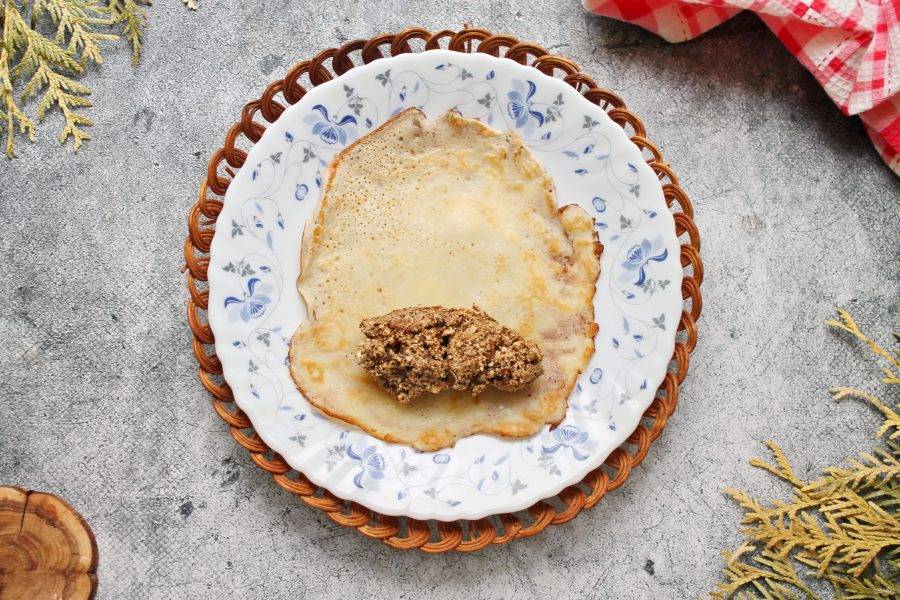 Разделите творожную массу на количество испеченных блинов. На край каждого блина выложите начинку и сверните в рулетик с закрытыми краями.