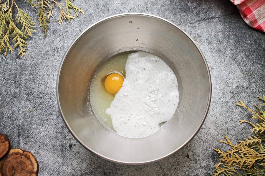 Добавьте в сыворотку соль, сахар, соду и разбейте яйцо. Всё хорошо перемешайте до однородности.
