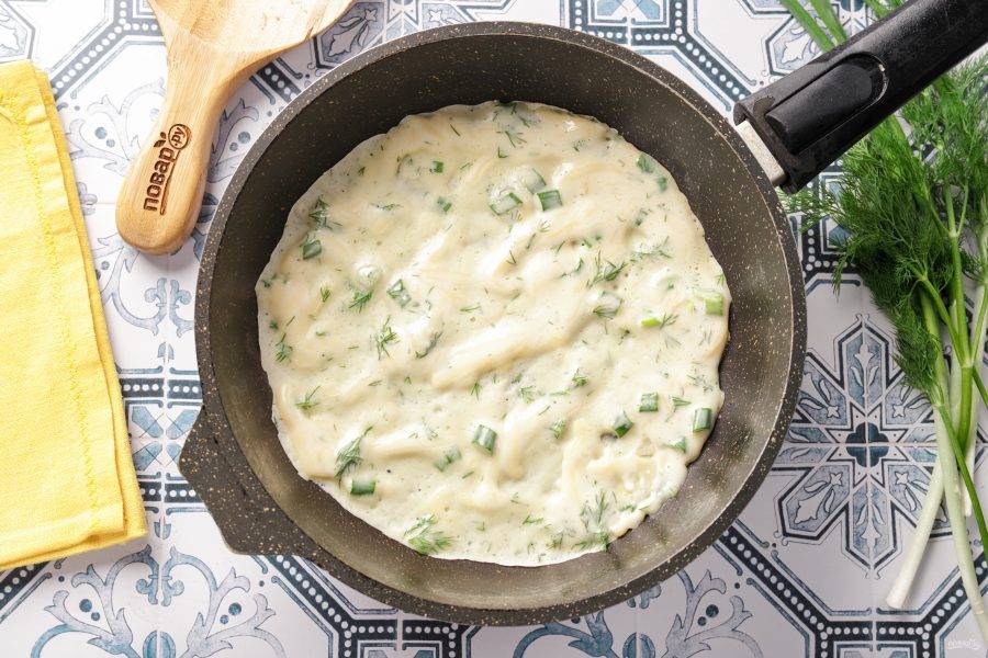 Всыпьте измельченную зелень — у меня лук и укроп.
