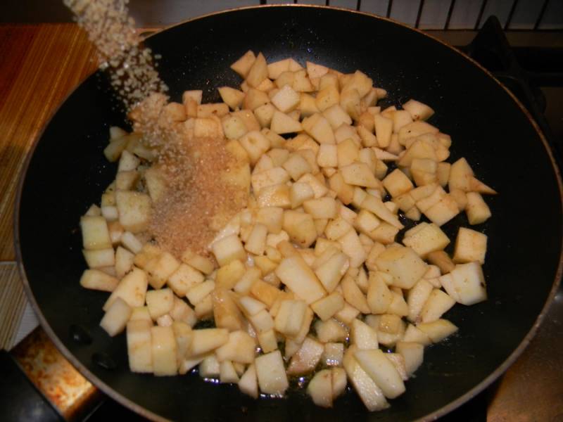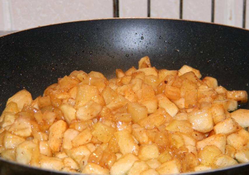 Снимаем крышку, прибавляем огонь и жарим яблоки до тех пор, пока они не начнут карамелизироваться. Снимаем сотейник с огня и отставляем в сторону.