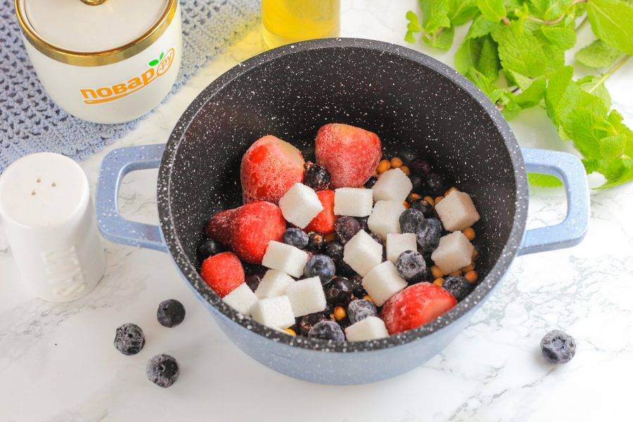 Ягоды промойте и добавьте в казан или в ковш вместе с сахаром. Если ягоды замороженные, то их промывать не нужно. Поместите емкость на плиту и включите умеренный нагрев.