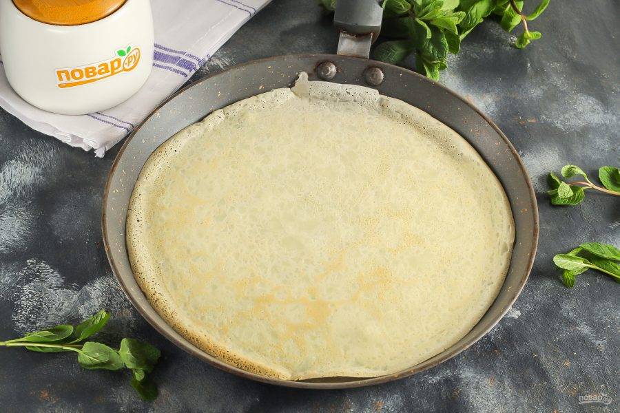 Прогрейте сковороду на плите и смажьте в первый раз растительным маслом. Уменьшите нагрев до умеренного и влейте половину половника теста. Округлите тесто на сковороде и испеките румяный блин по 1-2 минуты с каждой стороны. Таким образом испеките все блины.