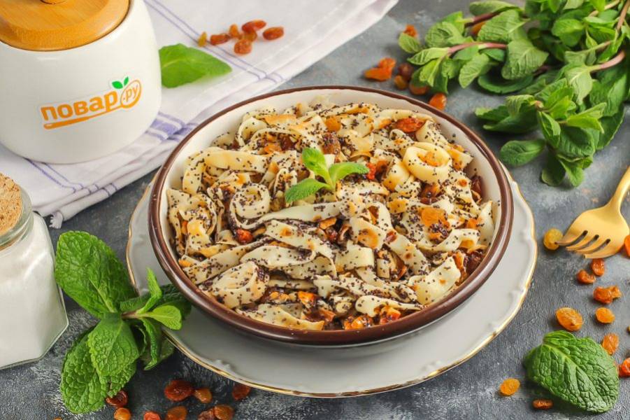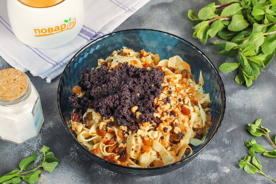 Мак высыпьте в пиалу или креманку и залейте кипятком. Оставьте набухать примерно на 25-30 минут. При желании можно те же манипуляции проделать и с изюмом, если любите его в более сочном виде.