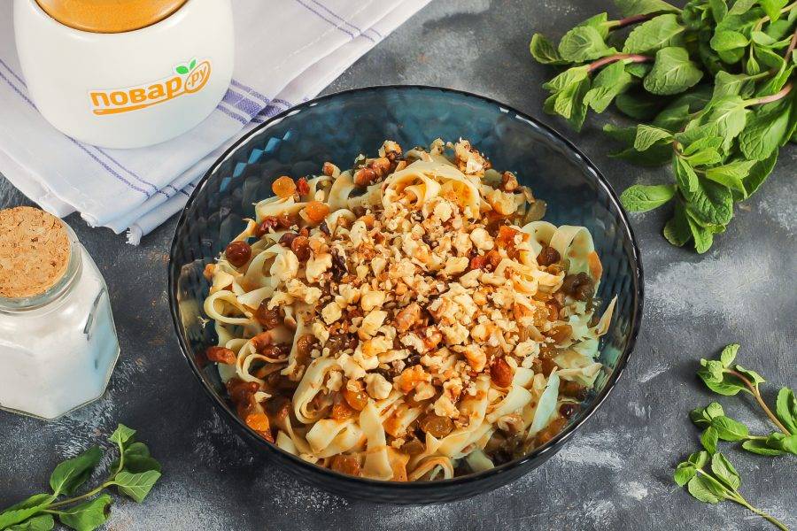 Измельчите в руках ядра грецких орехов, добавьте их к нарезке блинов вместе с изюмом.