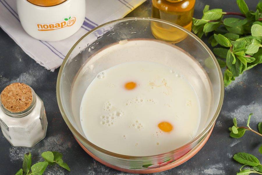Куриные яйца вбейте в глубокую емкость, всыпьте соль, сахарный песок и влейте молоко. Аккуратно взбейте все венчиком.