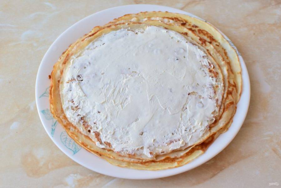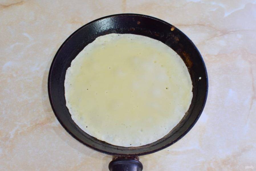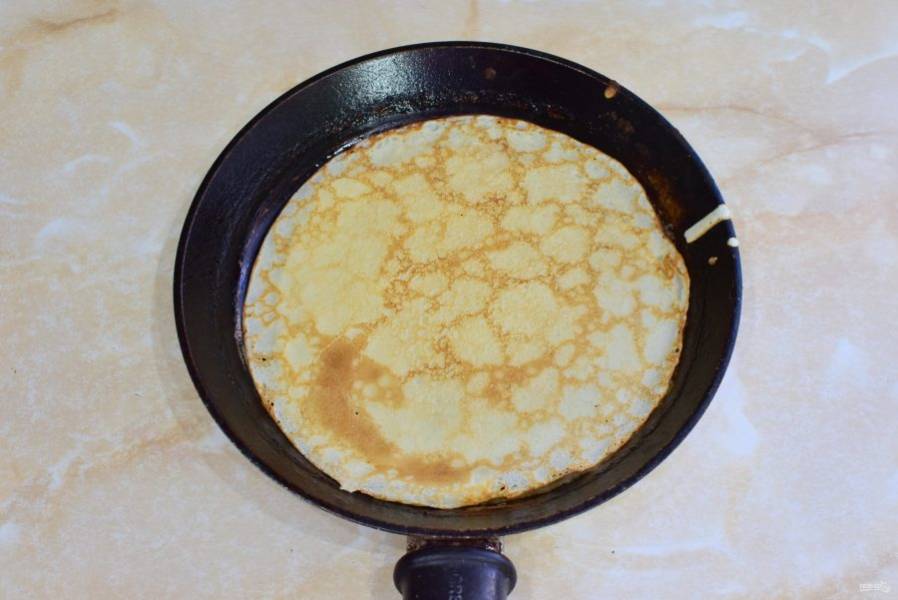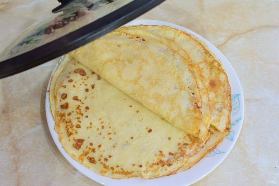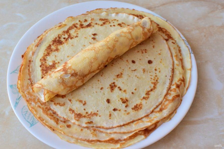 Напеките тонкие блинчики с двух сторон на небольшом огне.