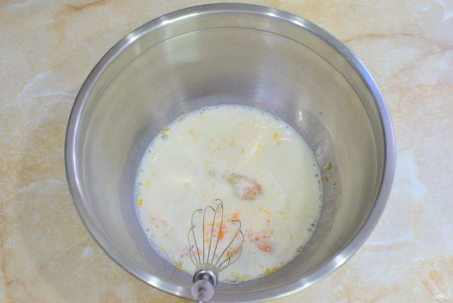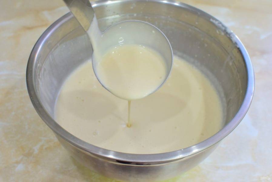 Готовое блинное тесто будет жидкое, чтобы блинчики получались тонкими.