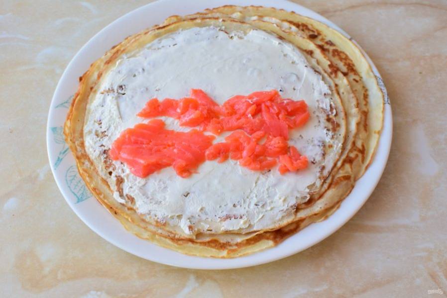 Приготовьте простые блинчики с непростой начинкой. Идеальным вариантом станет начинка из творожного сыра и красной рыбы. А для большей оригинальности, нарежьте блины небольшими рулетиками.