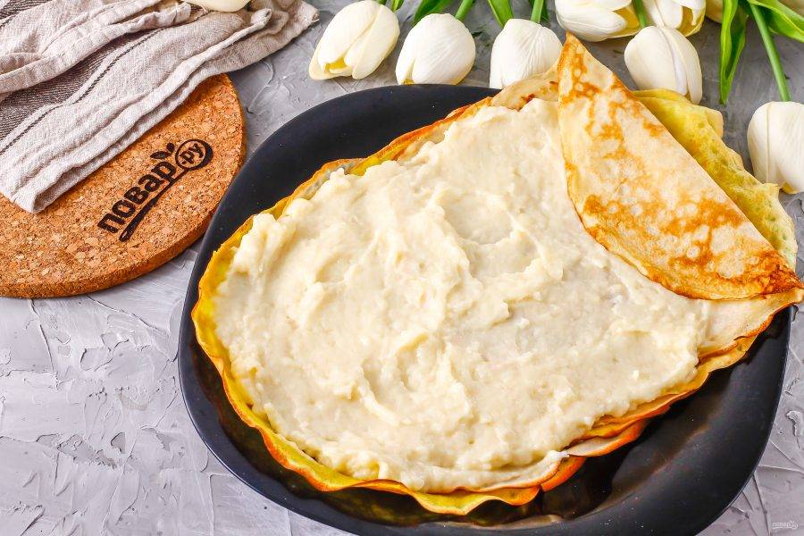 Подверните край блинов и заверните их рулетом. По желанию рулет можно охладить в холодильнике или сразу же нарезать.