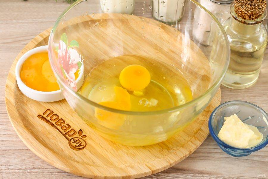 Два куриных яйца вбейте в глубокую емкость. Другие два разделите на желтки и белки. Белки добавьте в глубокую емкость, желтки отложите для приготовления крема. Всыпьте в глубокую емкость соль и сахарный песок, тщательно взбейте.