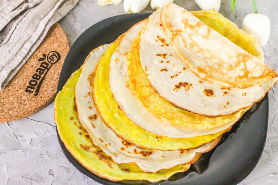 Затем тесто разделите на две половины, во вторую всыпьте куркуму и перемешайте. Испеките румяные блины в сковороде по 1 минуте с каждой стороны.