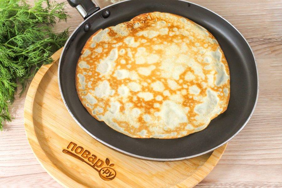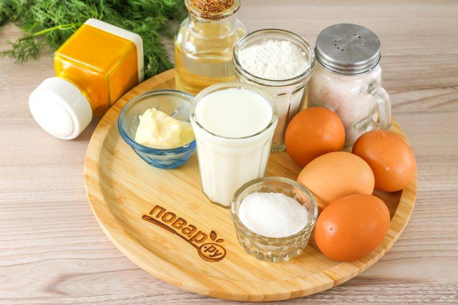 Подготовьте указанные ингредиенты. Можно приготовить половину блинов румяных и половину — с куркумой, чтобы рулет получился более красочным.
