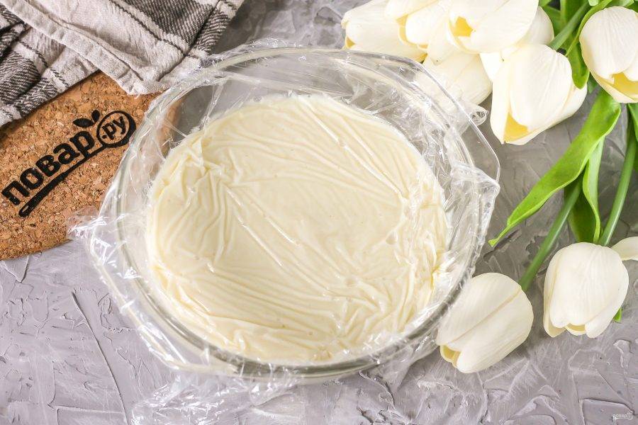 Крем обязательно остудите примерно 40-60 минут в холодильнике, накрыв пищевой пленкой стык в стык.