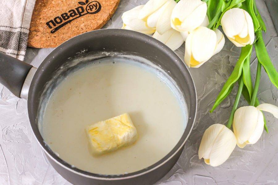 Вмешайте в заварной крем сливочное масло хорошего качества. Это можно сделать и после остывания крема — по желанию.