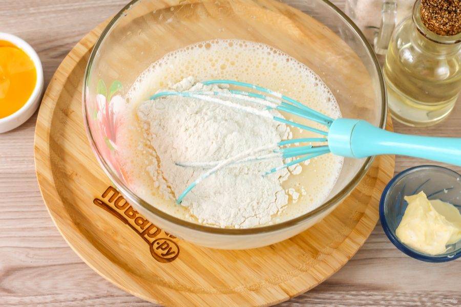 Всыпьте пшеничную муку, аккуратно вмешайте ее в тесто, чтобы не образовались комочки. Затем влейте растительное масло и оставьте тесто на 15 минут в покое.